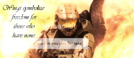 I did this one for a contest on another board. It's another simple one, basically just took one of my Halo 3 pics (the infamous One Winged Master Chief), sig-sized it, and added some text in GIMP. I'll give cookies to anyone who knows where the quote is from. :p